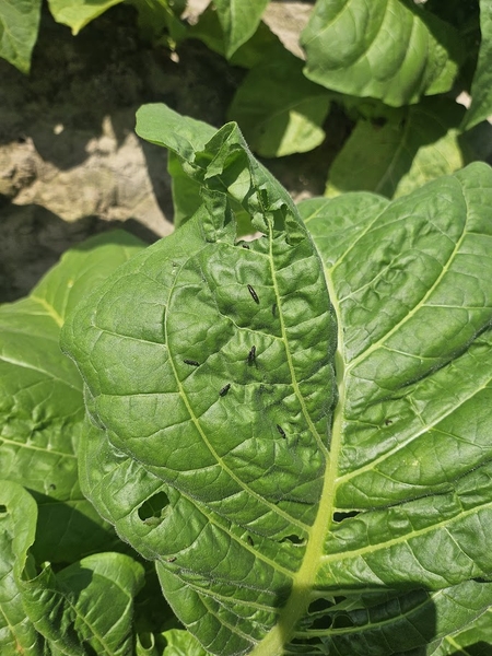 Grasshoppers damage tobacco by chewing ragged holes in the leaves (Figure 3). Most species prefer other plants but will eat tobacco if their food supply is inadequate. They often migrate into tobacco fields from hay fields, pastures, and old fields, especially when populations are high during droughts and following hay mowing or other habitat modifications. You can notice immature and adults grasshoppers resting on the leaves of tobacco or flying around when large populations are present. Also, they leave behing elongated frass in the leaves (Figure 4).