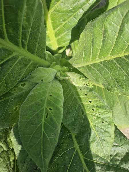 Tobacco budworm feeding results in holes in foliage and can destroy flowers and seed capsules in seed production. This type of damage is the most common caused by tobacco budworm and does not typically result in measurable yield loss. This is because budworm injury occurs prior to topping, while plants are still growing, and the plant can compensate for the weight loss to tobacco budworm feeding. In some cases, tobacco budworm feeding can result in the destruction of the apical growth point, prematurely topping the plant. This type of damage is of greater economic concern, because it potentially increases labor costs for sucker control; however, it is a much rarer type of damage (Figure 1).